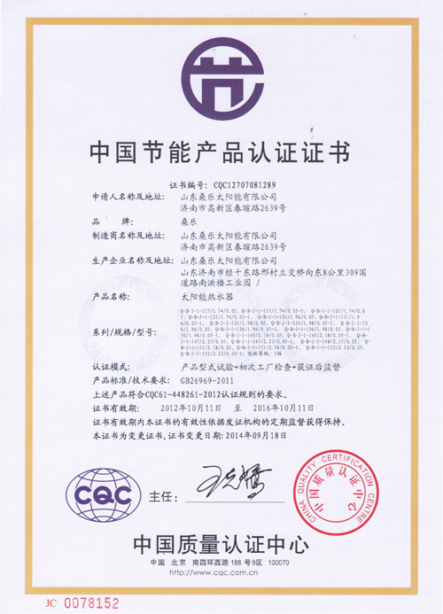 桑樂(lè)榮獲太陽(yáng)能熱水系統(tǒng)中國(guó)綠色產(chǎn)品認(rèn)證證書(shū)