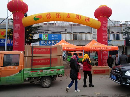 山東濰坊黃旗堡鎮(zhèn)一年一度的大型山會(huì)開(kāi)始了,每逢此時(shí),當(dāng)?shù)氐娜藗兌紩?huì)走出家門(mén),到山會(huì)上游玩采購(gòu)一些生活必需品。桑樂(lè)魯東市場(chǎng)部濰坊區(qū)域緊跟市場(chǎng)步伐,積極開(kāi)展冬季新產(chǎn)品促銷(xiāo)活動(dòng),把桑樂(lè)公司的太陽(yáng)能、凈水機(jī)、電熱水器等新產(chǎn)品強(qiáng)力推向市場(chǎng),擺到用戶面前。