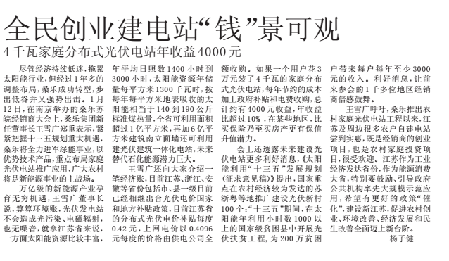 萬億級(jí)的新能源產(chǎn)業(yè)孕育無窮機(jī)遇,王雪廣董事長(zhǎng)說,算算環(huán)境賬,光伏發(fā)電站不會(huì)造成光污染、電磁輻射,也無噪音,就拿江蘇省來說,一方面太陽能資源比較豐富,年平均日照數(shù)1400小時(shí)到3000小時(shí),太陽能資源年儲(chǔ)量每平方米1300千瓦時(shí),按每年每平方米地表吸收的太陽能相當(dāng)于140到190公斤標(biāo)準(zhǔn)煤熱量,全省可利用面積超過1億平方米,再加6億平方米建筑南立面墻還可利用建光伏建筑一體化電站,未來替代石化能源潛力巨大。