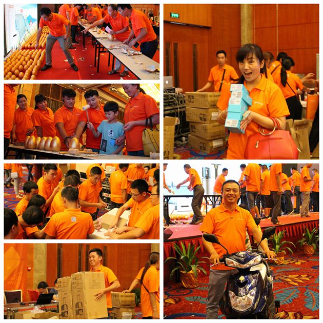 隨后,迎來了經(jīng)銷商交款砸金蛋,好運贏大獎環(huán)節(jié),把整個會場氣氛推向了高潮。一枚枚金蛋,閃著燦燦金光,隨著啪啪的敲擊聲,開出一個個巨獎,華為手機,速派奇電動車,蘋果手機……,誘人的獎品再一次掀起了打款的高潮,銷售經(jīng)理爭先恐后,積極定貨。