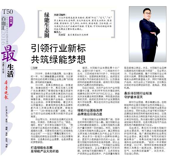 2016年,是桑樂擁抱社會、改革進取、銳意創(chuàng)新的一年,桑樂當家人王雪廣先生邀請到了管理經驗豐富且深諳市場營銷的馬全軍出任桑樂集團執(zhí)行總經理,全面提升系統(tǒng)管理,樹立全新網點銷售形象;積極完善產業(yè)鏈條,加快研發(fā)企業(yè)新品;改革營銷策略,建立多元化傳播理念;邀請倪萍擔任桑樂品牌形象代言人并提出桑樂新能源,綠能發(fā)展——“LE+綠能生態(tài)圈”戰(zhàn)略,將企業(yè)乃至行業(yè)的戰(zhàn)略發(fā)展方向提升至全新高度。
