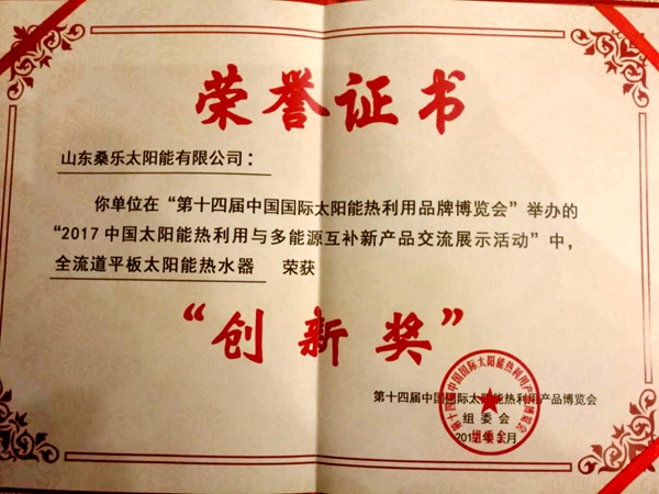 2017中國太陽能熱利用與多能源互補新產(chǎn)品交流展示活動頒獎盛典盛大舉行,桑樂集團(tuán)在第十四屆中國國際太陽能熱利用產(chǎn)品博覽會上獲得“創(chuàng)新獎”。隨著社會發(fā)展和人民生活改善,特別是進(jìn)入新常態(tài)以來,創(chuàng)新被國家確立為五大發(fā)展理念之首,國家和社會對太陽能熱利用行業(yè)提出了“鞏固擴大太陽能熱水市場,推動供暖和工農(nóng)業(yè)熱水等領(lǐng)域的規(guī)模化應(yīng)用,拓展制冷、季節(jié)性儲熱等新興市場,形成多元化的市場格局”的更高要求,太陽能熱利用行業(yè)唯有持續(xù)的創(chuàng)新,才能實現(xiàn)從量到質(zhì)的飛躍,不斷滿足社會發(fā)展對新能源的要求。中國太陽能熱利用產(chǎn)業(yè)聯(lián)盟執(zhí)行理事長張曉黎表示,本次太博會上組委會舉辦創(chuàng)新獎評選,目的是鼓勵和支持創(chuàng)新,鼓勵太陽能熱利用應(yīng)用在熱水、采暖、工農(nóng)業(yè)新領(lǐng)域。