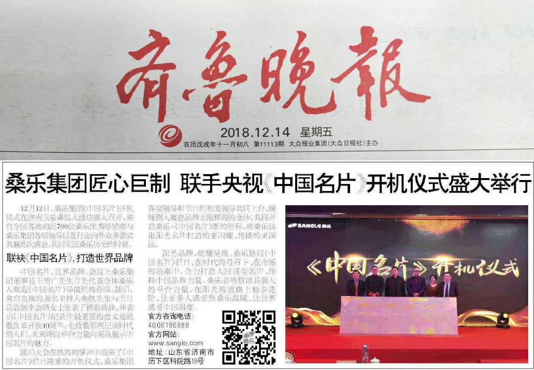 桑樂集團(tuán)匠心巨制,聯(lián)手央視盛大舉行《中國(guó)名片》開機(jī)儀式。在時(shí)代的號(hào)召下、在市場(chǎng)的浪潮中,全力打造大國(guó)頂尖名片、傳揚(yáng)中國(guó)品牌力量。桑樂必將借助其強(qiáng)大的平臺(tái)力量,在陽光的道路上穩(wěn)步進(jìn)階,讓更多人感受到桑樂溫暖,讓世界感受中國(guó)溫度。今日《齊魯晚報(bào)》就這一盛況做了專訪,具體內(nèi)容如下:
