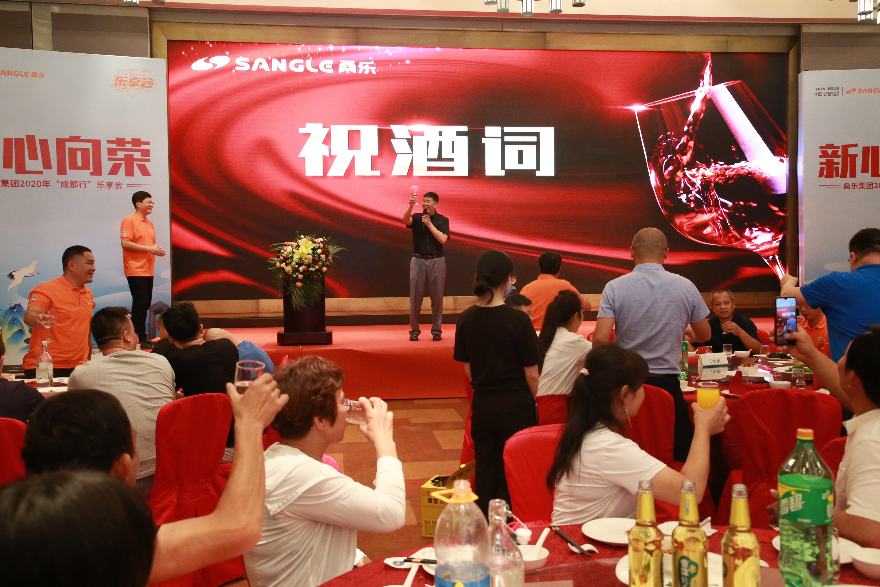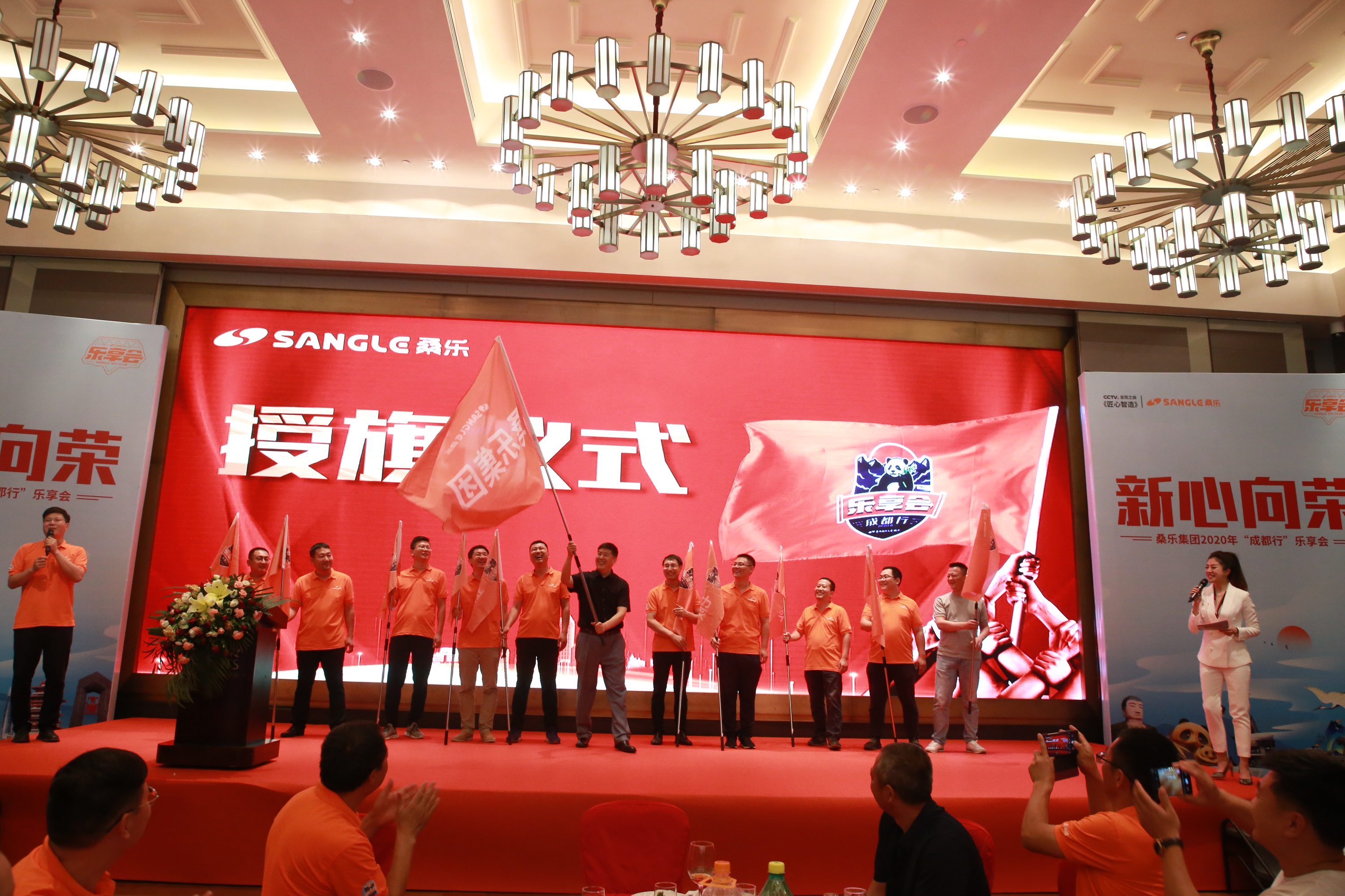 6月29日,為迎接來(lái)自各地經(jīng)銷(xiāo)商的到來(lái),集團(tuán)精心準(zhǔn)備了一場(chǎng)盛大晚宴,大家在觥籌交錯(cuò),珍饈佳肴中,氤氳著久別重逢的喜慶氛圍。此外,現(xiàn)場(chǎng)還舉行了授旗儀式,董事長(zhǎng)王雪廣親自授旗,經(jīng)銷(xiāo)商代表手握旗幟,在臺(tái)上揮旗飄揚(yáng),而這每一面旗幟都代表著桑樂(lè)不止所見(jiàn)的未來(lái)。