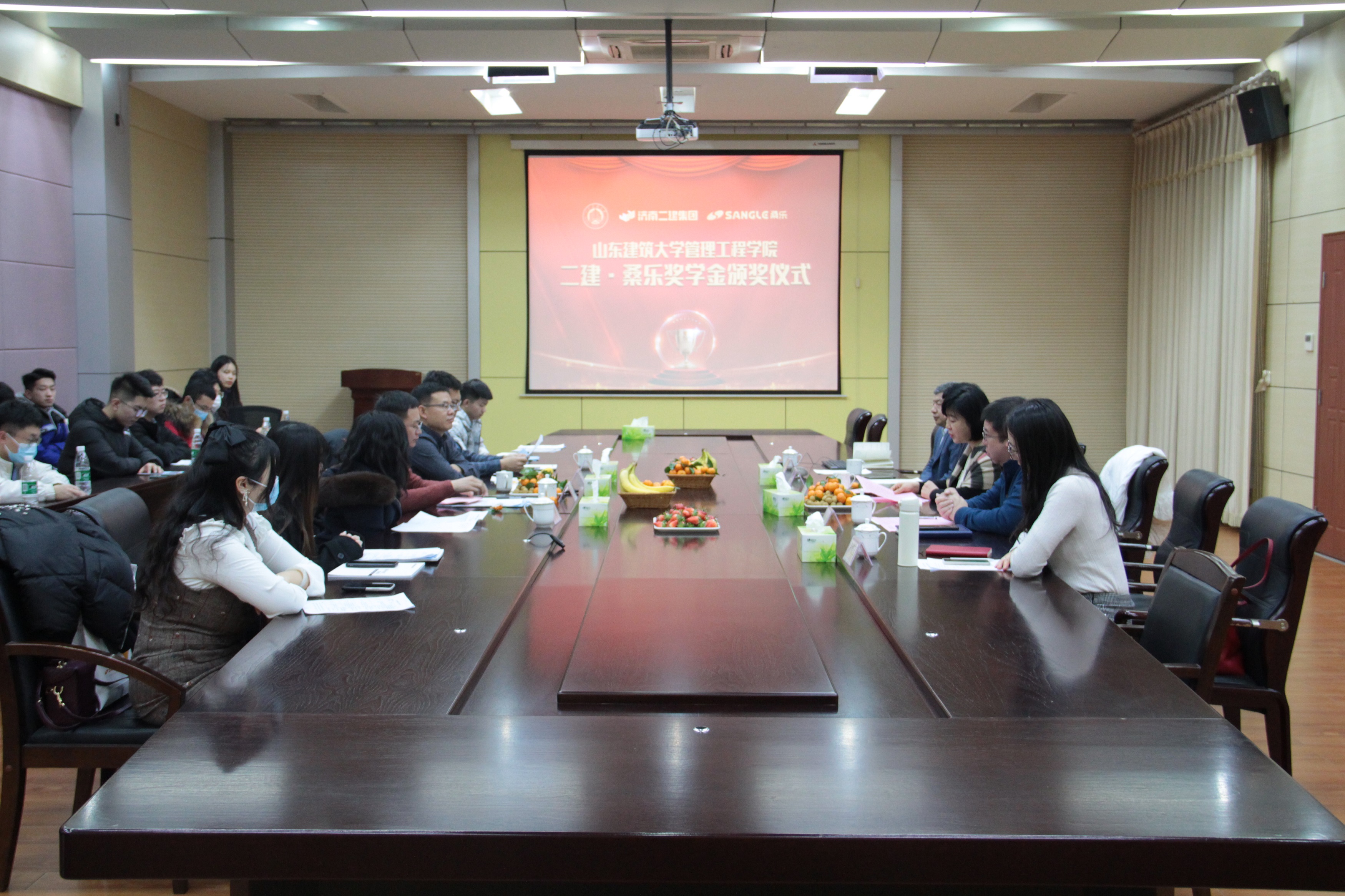 12月24日,濟南二建集團、山東桑樂集團資助山東建筑大學管理工程學院優(yōu)秀學生獎學金頒獎儀式在桑樂集團總部舉行。山東建筑大學管理工程學院院長王德東、團委書記張之穩(wěn)以及建大教師、學生30余名參加儀式。二建集團黨委書記、副董事長、桑樂集團董事楊瑩、濟南二建集團副總經理吳永平、桑樂集團常務副總馮磊等集團領導接待參會。