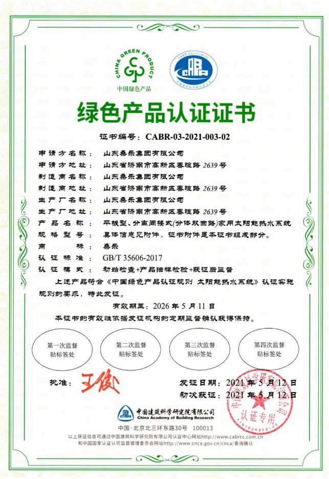 5月12日,通過(guò)中國(guó)建筑科學(xué)研究院有限公司認(rèn)證,桑樂(lè)集團(tuán)榮獲太陽(yáng)能熱水系統(tǒng)中國(guó)綠色產(chǎn)品認(rèn)證證書(shū),這也是中國(guó)建研院頒發(fā)的首個(gè)太陽(yáng)能領(lǐng)域綠色產(chǎn)品認(rèn)證證書(shū)。